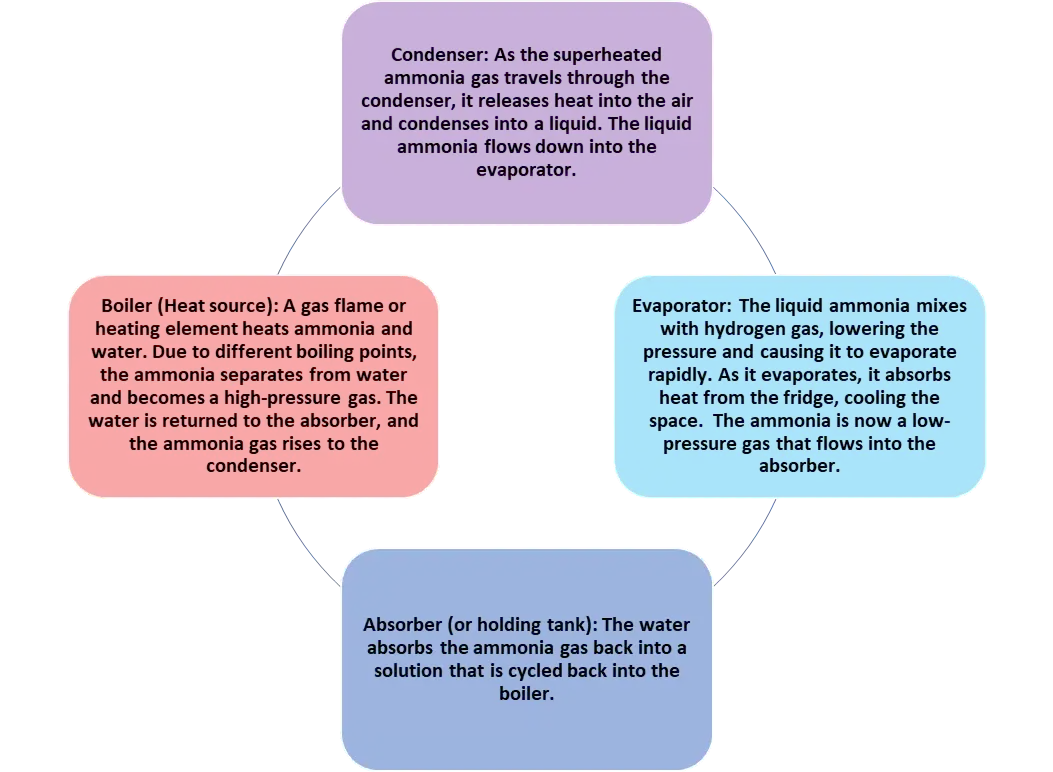 - A heat source (LPG flame, 12V, or 240V element) starts the process by boiling the ammonia solution.